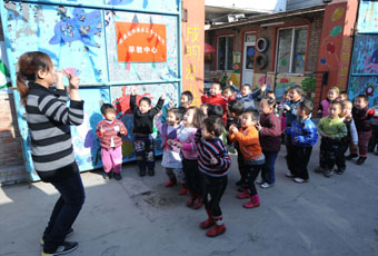19日,天津社區早教中心的老師帶領外來流動人口子女進行戶外活動。新華社記者 劉海峰 攝