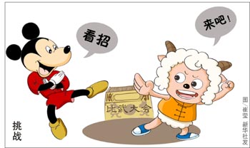 “迪士尼里有喜羊羊和灰太狼嗎?”聽到媽媽說2012年要帶自己去上海逛迪士尼樂園,5歲的小雅抱著喜羊羊的毛絨玩偶好奇地問。在她天真爛漫的小心靈里,喜羊羊和灰太狼的地位一點兒也不比米老鼠和唐老鴨遜色,因為它們都能令她感到快樂。 今年電影版的《喜羊羊和灰太郎》吸取美國《貓和老鼠》經驗,在前期培育了大批忠實觀眾的基礎上,最終取得了創意和票房的雙豐收。有人認為,中國年輕的動漫產業或能借此契機迎頭趕上;但是,比起以迪士尼為代表的美日動漫王國,喜羊羊是否已經具有抗衡米老鼠的能力?