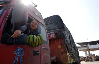 11月22日,一名運輸“補貼香蕉”的司機在廣西全州縣黃沙河高速公路出口處領到補貼后,準備駕車離開廣西。新華社記者 陳瑞華 攝