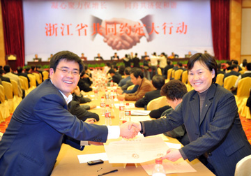 3月19日,來自浙江各地的119家知名國有與民營企業與本企業的職工方代表在杭州簽署“共同約定書”,承諾企業與職工攜手抵御國際金融危機給企業和職工帶來的沖擊,展現企業與職工利益共同體的形象!肮餐s定書”中企業承諾自覺承擔社會責任,穩定就業崗位,保障職工合法權益,在經營困難期間,做到不裁員或少裁員;職工方承諾與企業同舟共濟,共渡難關。遇到問題通過工會和職工代表大會等途徑合法解決。本次簽署“共同約定書”的企業共119家,涉及職工10萬多人。圖為中國電信杭州分公司的企業方代表(左)和職工方代表(右)在簽署“共同約定書”后握手。