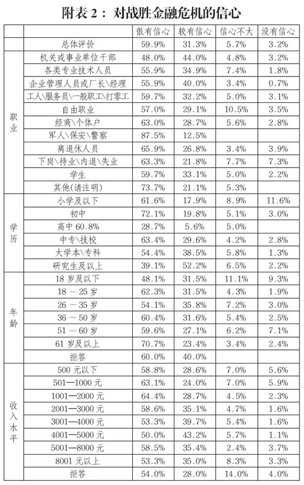 近2成的城市居民比較了解金融危機;但對于我國應對金融危機的措施,僅有2.8%的受訪農民表示非常了解,絕大多數只是知道一點,更有17.5%的受訪農民表示對相關措施“一點也不知道”。