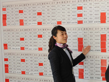 2009年貴陽市房地產開發累計完成近190億元,同比增長27.1%。2009年12月30日,貴陽一家房地產公司五天前推出的房子已售出1/3,售樓工作人員正在向看房者介紹情況(灰色表示已售)! ⌒氯A社記者 朱國賢/攝 |
