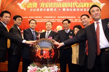 1月16日,嘉賓在論壇開幕式上啟動“E天下全球信息服務平臺”。由中國電子商務協會、世界物流發展促進組織等十機構聯合舉辦的“E消費開啟經濟新時代高峰論壇”在北京人民大會堂舉行。以“開啟消費全新模式 推動民族經濟發展”為主題的高峰論壇旨在應對全球金融危機,探索我國自主創新的電子商務發展、新的經濟增長點和各種新的經濟模式。新華社記者 張燕輝 攝