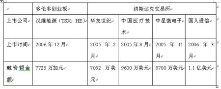 表1:漢維能源與納斯達克部分中國上市公司融資規模對比表