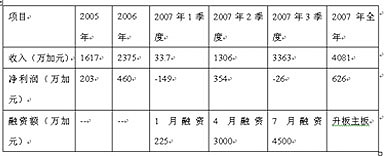 漢維公司2007年1季度公司業績表現不佳,而后續季度業績突飛猛進,正是其業績上表現出強力支撐,當期的財務數據表現靚麗,從而使后續融資非常順利。詳見下表: