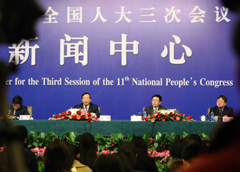 3月9日,中國人民銀行副行長、國家外匯管理局局長易綱(左一)就“外匯管理和外匯儲備”問題在北京梅地亞中心接受中外媒體的集體采訪。易綱重申,要保持人民幣匯率在合理、均衡水平上的基本穩定。新華社記者 袁滿 攝 | 聚焦 1 周小川:擇機退出危機時期人民幣匯率政策