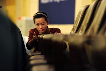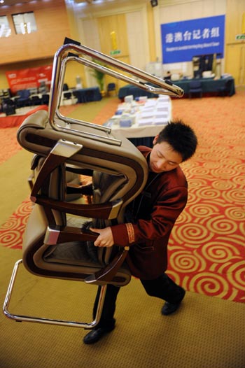 3月10日,新聞中心工作人員劉艷明和同事一起擺放座椅,要求各點整齊一線。