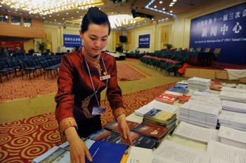 3月10日,新聞中心工作人員賀美麗在整理提供給記者的文件資料。