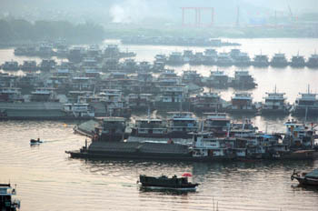 由于持續干旱造成西江水位下降和節后船舶運輸量增加等因素影響,截止3月13日,廣西長洲水利樞紐滯航船舶仍有300多艘。(新華社記者 黃孝邦/攝) |