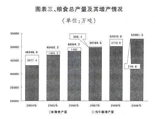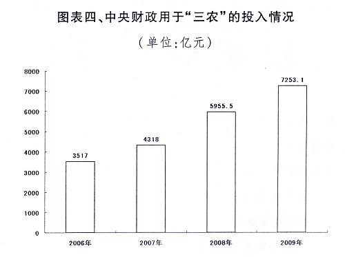 “三農”投入大幅增加。全年中央財政用于“三農”的支出達7253.1億元,比上年增長21.8%,其中,中央基建投資1890億元,增長1.5倍;對農民的四項補貼1274.5億元,增加244.1億元。銀行涉農貸款年末余額突破9萬億元,增長34.8%。啟動實施《全國新增1000億斤糧食生產能力規劃(2009-2020年)》。大型灌區節水改造、大型泵站更新改造、病險水庫除險加固,以及糧棉油糖等重要農產品生產基地和倉儲物流設施的建設繼續加強,對種養業良種工程、生豬和奶牛標準化規模養殖、植保工程和動物防疫體系、農產品質量檢驗檢測體系以及糧食豐產科技工程等支持力度加大。