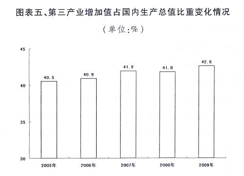 服務業穩定發展。鼓勵服務業發展的政策措施得到進一步落實,財稅、供地、價格、金融等方面對現代服務業的支持力度加大,一批跨地區、跨行業、帶動功能強、支撐作用大的服務業重大項目建設順利開展。金融保險、信息服務、物流配送、社區服務等發展迅猛,新興業態不斷涌現。第三產業增加值占國內生產總值的比重達42.6%,比上年提高0.8個百分點。