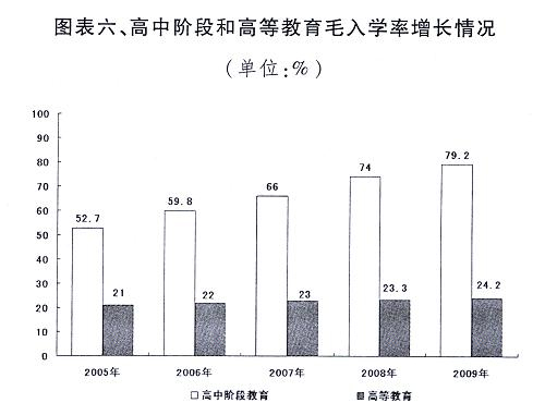 各項社會事業全面進步。社會事業基礎設施建設得到加強,2008年四季度以來,中央政府用于社會事業發展方面的基建投資550多億元,超過“十五”時期的總和。城鄉免費義務教育政策全面落實,中西部地區農村初中校舍改造和全國中小學校舍安全工程積極推進,改造農村初中校舍面積670萬平方米,建成中等職業學校和特殊教育學校校舍314萬平方米。初中階段三年保留率達到94%,提高0.3個百分點,高中階段毛入學率達79.2%,提高5.2個百分點,超過計劃2.2個百分點;普通高校招生639.5萬人,增加31.8萬人,超過計劃10.5萬人,研究生招生51.1萬人,增加6.5萬人,超過計劃3.6萬人;鶎俞t療衛生服務體系和計劃生育設施建設繼續加強,建成17171個基層醫療衛生服務機構、4522個基層計劃生育服務項目,甲型H1N1流感防控工作依法科學有序進行。人口自然增長率5.05‰,實現了7‰以內的計劃目標。國家博物館、國家圖書館二期等重大文化項目建設進展順利,建成鄉鎮綜合文化站5062個,免費開放的博物館、美術館、圖書館等公共文化設施1444家。廣播、電視人口覆蓋率分別達到96.3%和97.2%,廣播電視村村通工程提前一年完成“十一五”規劃任務。紅色旅游精品景區建設規劃目標全面實現。哲學社會科學、新聞出版、文學藝術和體育等事業繁榮發展。第十一屆全國運動會成功舉辦。上海世博會園區建設基本完成。