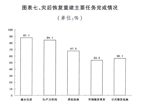 汶川地震災后恢復重建規劃實施取得重大階段性成果。重災區累計完成投資6545億元,占規劃總投資的65.5%,農村住房重建任務基本完成,城鎮住房重建加固全面展開,學校、醫院和基礎設施建設進展順利,北川、汶川、青川縣城以及映秀、漢旺等重災城鎮建設加快。震區文化遺產保護得到加強。對口支援工作成效顯著。