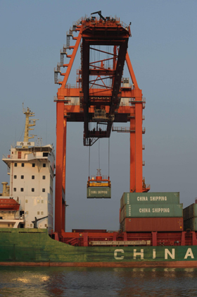 繁忙的防城港碼頭塔吊在裝卸貨幣。新華社記者 劉廣銘/攝