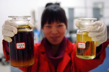 青海潔神環境能源產業有限公司工作人員在對比“地溝油”(左)和由餐廚垃圾處理而成的生物柴油。新華社記者 張宏祥 攝