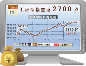 5月13日,受央行在公開市場投放資金、主板市場暫停新股發行傳聞以及美國道指收復上周全部跌幅等利好消息的影響和提振,A股市場終于迎來技術反彈。其中,滬指在時隔18個交易日后重新登上5日線,并且重新站上2700點整數關口,市場重心有所上移。 統計數據顯示,當日滬綜指開于2653.58點,最高2711.07點,最低2646.90點,收于2710.51點,漲54.79點,漲幅2.06%,成交額907.36億元;深成指開盤10161.18點,最高10417.81點,最低10114.68點,收于10417.81點,漲271.17點,漲幅2.67%,成交額633.24億元。 從盤面看,石化雙雄、銀行、有色金屬等權重板塊的集體拉抬為大盤重新企穩奠定了基礎,再加之智能電網、西藏、新材料、低碳、醫藥等中小盤股集中的眾多板塊也相繼企穩,市場做多熱情重燃。 其中,銀行股活躍,深發展A、交通銀行、中國銀行、工商銀行等銀行股大幅上漲,帶動金融板塊全線飄紅。煤炭板塊強勁上揚,國投新集領漲,高開高走漲逾7%,西山煤電、潞安環能、國際實業、上海能源、平煤股份等漲逾5%。有色金屬板塊午后崛起,西藏礦業、包鋼稀土、章源鎢業漲停,中孚實業、廈門鎢業、貴研鉑業、東方鉭業、寶鈦股份等漲逾6%;w板塊強勢,華峰氨綸漲停,華西村、海利得、煙臺氨綸、澳洋科技等漲逾6%。截至收盤,化纖板塊漲4.04%,位于漲幅榜第一。 中國人民銀行當天發行了200億元3個月期央票,并進行了300億元的91天期正回購操作;加上本周二發行了140億元1年期央票,使得本周公開市場合計回籠資金僅為640億元。同時,由于本周到期釋放資金量高達2160億元,這就意味著本周凈投放資金規模達到1520億元,結束了連續11周以來的資金凈回籠格局。 當天還有傳聞稱,由于新股頻頻破發,使得管理層有暫緩主板新股發行的意圖。對此,世基投資認為,其實結合2008年熊市管理層對市場公開操作來看,停發新股IPO的可能性是很大的。特別是在目前歐美重陷債務危機,我國經濟有面臨二次探底可能的關鍵時候,資本市場的穩定尤為重要。 在周四發布的報告中,中金公司明確表示,權重股表現較好不代表利空已消化完畢,前期強勢個股顯示補跌的跡象,當前保持低倉位仍然是好的投資策略。中金公司認為,弱市中不存在持續的防御性板塊,以醫藥板塊為例,此輪調整以來醫藥板塊表現明顯好于大盤,但目前醫藥股相對于大盤的估值溢價已經非常高,在股指持續下跌的情況下,醫藥股同樣存在補跌的壓力。 愛建證券分析師袁俊認為,從技術指標看,滬指只要不跌破2673點則意味著從3157點開始的下跌暫告一段落,后市個股將呈現分化走勢。但是要提醒的是中小板的部分公司大小非即將開始流通,建議投資者密切關注相關大小非的動向,畢竟以后大小非對于股票的波動會有較大的影響。 根據平安證券策略分析師蔡大貴的判斷,上證指數在2600點左右形成了較強的支撐,具備反彈基礎。反彈的空間不會很大,估計在10%左右,可能是以較為反復的形式進行。新興產業等中小市值概念股仍是市場關注焦點,目前市場還不具有推升大盤權重股的條件。