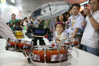 在北京舉行的第十屆科博會上,眾多最新科技成果及產品令參觀者大開眼界,特別是機器人的各種模仿表演吸引了許多小朋友的目光。新華社發(陳曉根/攝) |