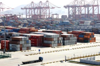 上海洋山深水港碼頭集裝箱堆場上的載貨集裝箱等待轉運。上海海關近日發布的上海外貿進出口數據顯示,2010年前4個月上海關區累計實現進出口總額2002.2億美元,同比增長38.1%。新華社記者