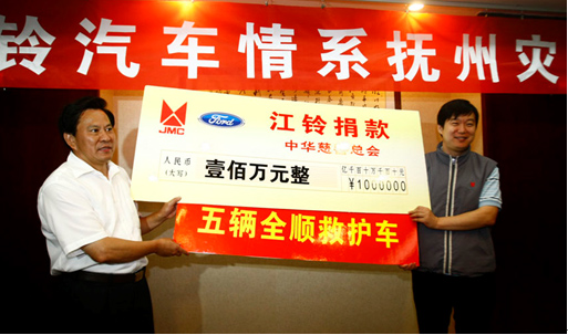 在江西等地發生的嚴重洪澇災害,造成了巨大的人員財產損失,牽動著國人的心。江鈴汽車股份有限公司全體員工心系災區人民,在第一時間作出反應,得到福特汽車公司和江鈴集團的支持,迅速組織賑災捐贈,在公司董事長王錫高指示下,公司緊急捐贈5輛災區急需的福特全順救護車并捐款100萬元人民幣,總計200萬元的款物給受災最嚴重的撫州洪澇災區。