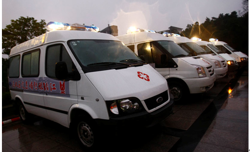 江鈴緊急趕制的5輛福特全順救護車一到達災區,立即被派往受災前線救護受災民眾。 |