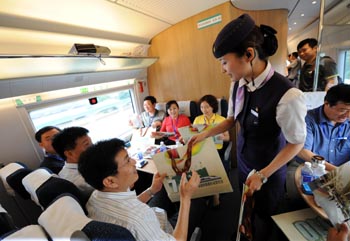7月1日,滬寧城際線G5001次列車的列車員在向旅客贈送滬寧高速鐵路開通運營紀念郵品。本報記者 孫參/攝 |
