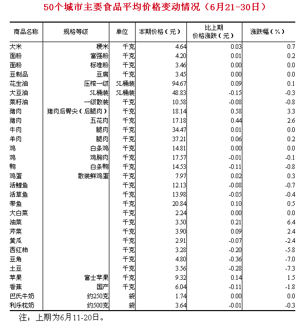 7月5日,國家統計局在其官網上公布“50個城市主要食品平均價格變動情況(6月21-30日)”顯示,豬肉價格明顯反彈。其中,豬肉后臀尖(后腿肉)每千克18.14元,比6月中旬(下同)上漲3.3%,五花肉每千克17.18元,上漲2.6%。其他肉類價格基本持平,漲跌幅均在1%以內。 蔬菜價格漲跌互現。油菜、芹菜分別上漲6.4%和2.4%。黃瓜、西紅柿、豆角、土豆價格明顯下跌,跌幅分別為2.4%、5.8%、7.0%和7.3%。