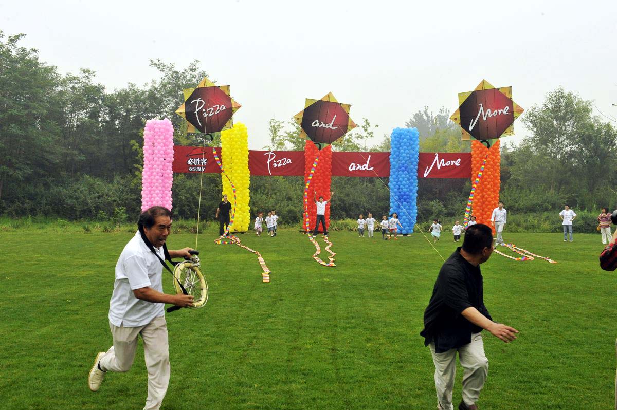 1只8平米的大風箏需要3個成年人才能放飛到天空。7月11日,在9位風箏高手的配合下,3只巨型風箏帶著必勝客的新口號“Pizza and