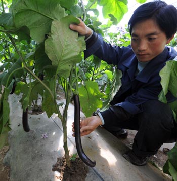 中國西部航天育種基地培育的航天蔬菜。技術人員丁耀宏展示正在進行選育的一種航天茄子。新華社記者 韓傳號