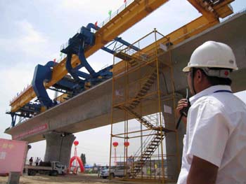 6月18日,陜西興平西寶客運專線架梁施工現場,西?瓦\專線全線開始架梁。新華社記者李一博/攝