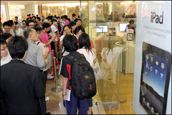 7月23日,蘋果iPad登陸香港市場,市民、游客在銅鑼灣時代廣場蘋果專賣店門前排起長隊。新華社記者 宋振平/攝 |
