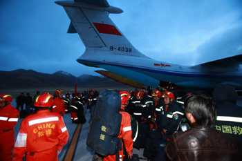 中國國際救援隊搭乘空軍運輸機抵達青海玉樹。新華社發 |