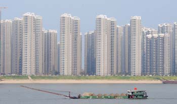 記者日前從長沙市建委獲悉,2010年上半年長沙房地產成交面積同比增長103%。據長沙市房產研究中心最新統計數據顯示,上半年長沙市(含郊縣)商品房施工面積5589萬平方米,新開工面積1322萬平方米,竣工面積399萬平方米。上半年長沙市(含郊縣)實現商品房銷售面積1102萬平方米(其中新建商品房累計簽約80972套),銷售金額462億元。圖為長沙市湘江沿岸新建的商品房小區。新華社記者 龍弘濤/攝 |