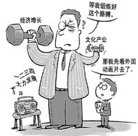 中國經濟已經持續20年高速增長,但是文化產業仍然是低位徘徊。數據顯示,2004年,中國文化產業實現增加值3440億元,僅占GDP的2.15%;從業人員996萬人,僅占中國全部從業人員的1.3%。目前中國上萬億美元的外貿額中,出口已經過半,但其中的文化產品出口不到1%。