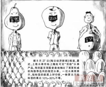 據8月27日《每日經濟新聞》報道,最近,上海水果市場上隨處可見“頂級”水果產品,有的甚至冠冕堂皇地拋出了某某權威機構推薦選用的指定水果。一位水果商表示,貼標簽的能賣上好價錢,一般要比不貼標簽的高出10%-30%不等。