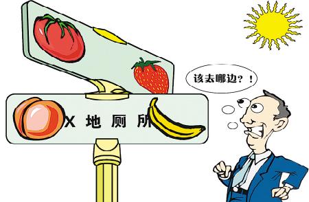 近日河南對全省城市公共標志做了一次調查,結果鄭州的公共標志最差最亂,公廁標志的不合格率高達60%以上。有公廁男廁門上是個“香蕉”的標志,女廁門上是“壽桃”的標志,常有顧客猶豫不敢進。(相關報道見14版) 公共標志不是藝術創作,原因很簡單,旨在為民眾提供生活便利引導的公共標志,應該也只能以便民為前提。如果說“富有創意”的廁所名稱,會引發如廁者茫然無措的尷尬的話,那么,交通指示牌不規范,則會呈現更嚴重的癥狀——司機被罰款、路人迷路事小,公共交通安全事大。況且,公共標志的問題,不僅僅存在于如廁和交通兩個方面,涉及公共生活的所有細節。
