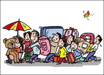 又到大學新生入學時,武漢某高校的一位女生除了爺爺奶奶、父母和小姨、舅舅等7人接送外,還攜帶著十大箱行李。其中有媽媽買的3床厚被子;爸爸買的筆記本電腦;親戚送的各種禮物、零食、玩具等,所帶的東西足足裝了十大箱。前日一早,一家人浩浩蕩蕩來到武漢,打了三輛的士才勉強擠進去。(27日《武漢晚報》)