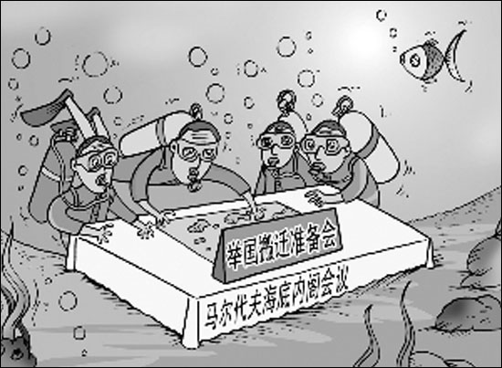 馬爾代夫總統將在水下6米處海底主持一次內閣會議,討論通過決議呼吁重視溫室效應。在氣候變化面前,馬爾代夫已經成為人類命運的一面鏡子。這個彈丸小國正為最壞的情況做準備,那就是舉國搬遷。