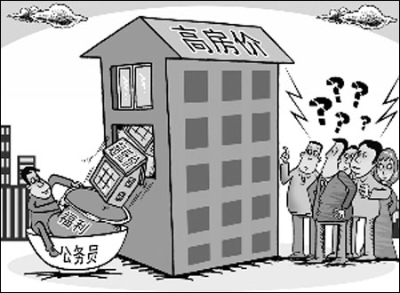 北京六里橋地區的房價從去年的每平方米2萬飆升至如今的3萬左右,但卻有一個特別的小區,去年剛建的,樓價是每平方米5000元。原來是一些政府部門變相福利分房!住房和城鄉建設部政策研究中心主任陳淮說,這是公務員住房的“超國民待遇”。