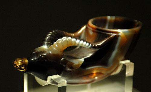 日前,《大唐遺寶——何家村窖藏出土文物展》在陜西歷史博物館開展。這次展覽匯聚陜西歷史博物館收藏的何家村窖藏出土文物300余件,是何家村窖藏出土文物出土以來首次大規模集中展示!拔靼埠渭掖褰巡亍,因1970年出土于西安市何家村而得名。其出土文物因數量眾多、種類繁復、工藝精美、保存完好著稱于世,被譽為二十世紀隋唐考古最為重要的考古發現之一。圖為正在展出的鑲金獸首瑪瑙杯。