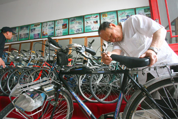 “這些車大多是英國和日本產的,還有一小部分是荷蘭、泰國和馬來西亞生產的!卑【傻耐趺鳝t老人說,這些自行車寶貝都是他一輩子的心血,為了收藏這些寶貝,他幾乎傾注了所有的積蓄和業余時間。他時不時地要轉一轉北京和外地的舊貨市場,最常去的是上海、天津、長春等地。他弄到手的車通常都有七至八成新,但也有一些剛買回來的時候比較破舊,需要自己修理。