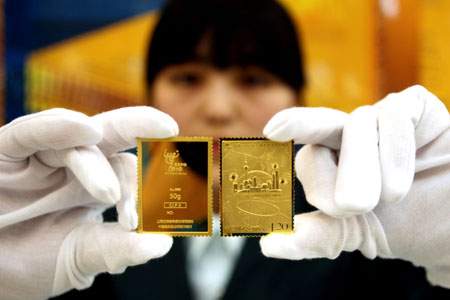 為紀念中國2010年上海世博會開幕,中國郵政發行《中國2010年上海世博會開幕紀念》郵票一套一枚,日前,中國集郵總公司以開幕郵票圖案特別制作發行《〈中國2010年上海世博會開幕紀念〉郵票金磚》一組三款。這是繼中國郵政發行《〈開國大典〉郵票金磚》及《〈庚寅年〉郵票金磚》之后第三組編號限量發行的郵票金磚。