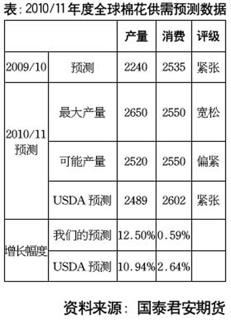 近段時間以來,國內棉花價格穩步上漲,并成功站上高位。不斷擴大的銷售利潤使得供給方變得更加惜售,在全社會可供總量非常緊張的情況下,下游企業不得不被動接受高昂的棉價。在接下來的7-8月,由于社會庫存的進一步消耗,棉花的供應形勢可能更加緊張,棉花價格由于缺乏有效的利空作用,還看不到要下跌的任何跡象。因此,從短期來看,支持棉價上漲的因素依然存在,棉價繼續上漲是大概率事件。 當前棉花價格的高企歸功于供需關系的相對緊張。2009年8月份以來,全球棉花供需關系開始由緩和轉變為趨緊(產量減少、消費增加),棉花價格也隨之大幅度上漲。美國農業部6月供需報告顯示,全球2009/10年度棉花產量預估為1.0289億包,2008/09年度棉花產量預估為1.0740億包。6月份預估消費為1.1643億包,2008/09年度預估消費為1.0994億包,增加647萬包。在全球經濟從歷史的低谷逐步走出來以后,商品價格集體回暖為棉花價格上漲提供了可靠的大環境,而惡化的供需矛盾則為棉價安裝上了騰飛的翅膀。 但2010/11年度棉花價格有望從高位回落。因為高價格會刺激棉花主產區面積擴種,從而會極大地緩和供需偏緊的基本格局。根據我們的預測,2010/11年度,全球棉花產量將從本年度的2240萬噸增加到2520萬噸,合計增產280萬噸,增幅為12.50%。產量增加使得“供需情況”得到很好改善,并對基金多頭形成威懾,使得多逼空的可能性進一步減小,價格繼續上漲的動力被有效削弱。 歷史經驗告訴我們,高價格往往難以為繼。預計到2010年12月份,棉花價格也有望從目前的18000元/噸回落到14000-16000元/噸的核心區域,價格下跌的最可能月份大概在10月份以前。