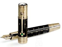 藝術贊助人“伊麗莎白一世”為888系列K金墨水筆配以名貴的焗漆筆桿及筆帽,18K金筆嘴刻有皇冠圖案,象征女皇1559年登基時佩戴的冠冕;筆帽頂鑲珍珠貝母萬寶龍六角白星標志,飾以都鐸王朝玫瑰K金徽章;筆夾則鑲有一顆方形綠色石榴石,與女皇皇冠的珠寶飾呼應;而女皇年輕時自制《The
