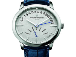 Constantin)鉑金珍藏系列Patrimony星期與日期逆跳鉑金腕表江詩丹頓的這款經典腕表系列采用鉑金表殼和表盤,限量發行100枚,均含獨立編號。這款腕表最顯著的特征是星期與日期逆跳功能,飛返指針完美融合了先進技術與時尚風格。深藍色鱷魚皮表帶則采用真絲與鉑金絲混織的線手工縫制而成。表殼:鉑金材質,圓形表殼,鉑金底蓋。表盤:拋光鉑金,棒形指針,箭形、圓形及棒形刻度。機芯:自動上弦機械機芯,日內瓦印記,27枚寶石軸承,40小時動力儲備,每小時振頻28,800次。功能:時、分、星期和日期顯示,逆跳指針。
