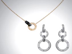 雙環緊扣,仿佛你我的手緊密相牽,彼此相連?ǖ貋啚槿 雙環恒久系列賦予了絕美象征:無論是項鏈、手鏈,還是耳墜,都將愛的美好與溫情誠心寓于牽手雙環之中。愛的承諾化身緊扣的雙環,如精致的標點,嵌入愛人們的喃喃細語中。 黑色高科技精密陶瓷與璀璨奪目的鉆石和熠熠生輝的玫瑰K金巧妙融合,奪目的光澤呼應低調的啞光,明暗對比之下,深邃自如的氣質傾心流出;而在閃亮的鉆石與白K金的相互映襯下, 雙環恒久系列閃耀絕倫,盡顯尊貴大氣。