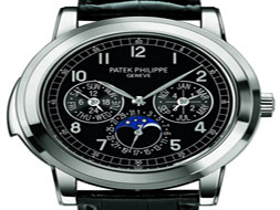 百達翡麗(Patek Philippe)Ref. 5074P鉑金腕表42毫米鉑金表殼氣魄非凡,其左端滑塊可啟動兩響教堂琴音報時裝置。這款自動上弦腕表的另一復雜功能是指針可顯示星期、日期、月份及閏年,并配備月相顯示的萬年歷。表殼:鉑金材質,圓形表殼,藍寶石水晶底蓋可顯示機芯運轉,亦可更換為鉑金底蓋。表盤:烏木黑色漆面,葉形指針,阿拉伯數字時標,軌道式分鐘刻度。機芯:Calibre R27Q,自動上弦機械機芯,原廠制造。功能:時、分、上/下午顯示,萬年歷,月相,三問報時。