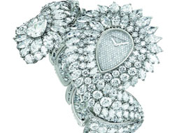 海瑞·溫斯頓(Harry Winston)Tango鉑金腕表表采用水滴造型,鉑金表殼與表鏈均鑲嵌各種寶石:1枚水滴型切割鉆石,72枚橄欖型切割鉆石,432枚明亮型切割鉆石,101枚長階梯型切割鉆石,606枚寶石,總重不少于66.45克拉。表盤無刻度指示,指針動力來源于石英電子機芯。表殼:鉑金材質,水滴造型,鉑金底蓋表盤:密鑲鉆石,棒形指針。機芯:石英電子機芯。功能:時、分顯示。