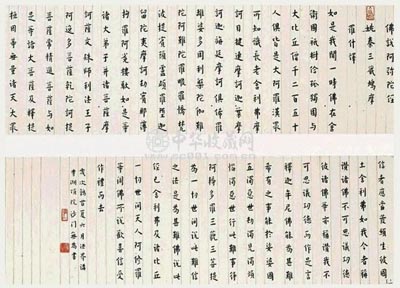 1931年6月,紀念亡父誕辰120周年,弘一法師以姚秦三藏鳩摩羅什翻譯的《佛說阿彌陀經》全文為內容完成了一生中最大尺幅的書法作品《佛說阿彌陀經》。日前,這一遺墨在上海朱屺瞻藝術館舉辦的“海上因緣——李叔同(弘一法師)、陸維釗、吳一峰書畫精品展”上亮相。 《佛說阿彌陀經》為楷書,全文加上63字款跋總計1836字。據介紹,《佛說阿彌陀經》是弘一法師分16天寫成的,當時就引起了轟動。弘一法師把它送給了劉質平,報答他對自己生活的照料。劉質平是弘一法師的學生、現代著名音樂教育家。那年,弘一法師住浙江鎮海伏龍寺,劉質平前后侍奉一個多月。對于這件遺墨,劉質平視同生命,雖歷經動亂與貧困,一直悉心保存。1978年劉質平逝世后,墨寶由其子劉雪陽收藏。2000年,劉雪陽將《佛說阿彌陀經》獻給國家。
