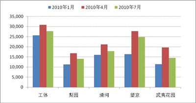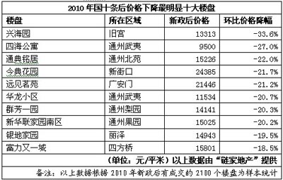 新政后全北京市120個商圈價格幾乎全面下跌,與4月初相比,降幅超過10%的商圈達70個,比重達58%;其中43個商圈價格回歸到2010年初。典型商圈二手房價均經歷了價格沖高后回落的過程。