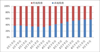 新政一百天,外地人購房比例已經下降到43%左右,比調控前的商貸最高峰4月上半月比重下降高達24%。